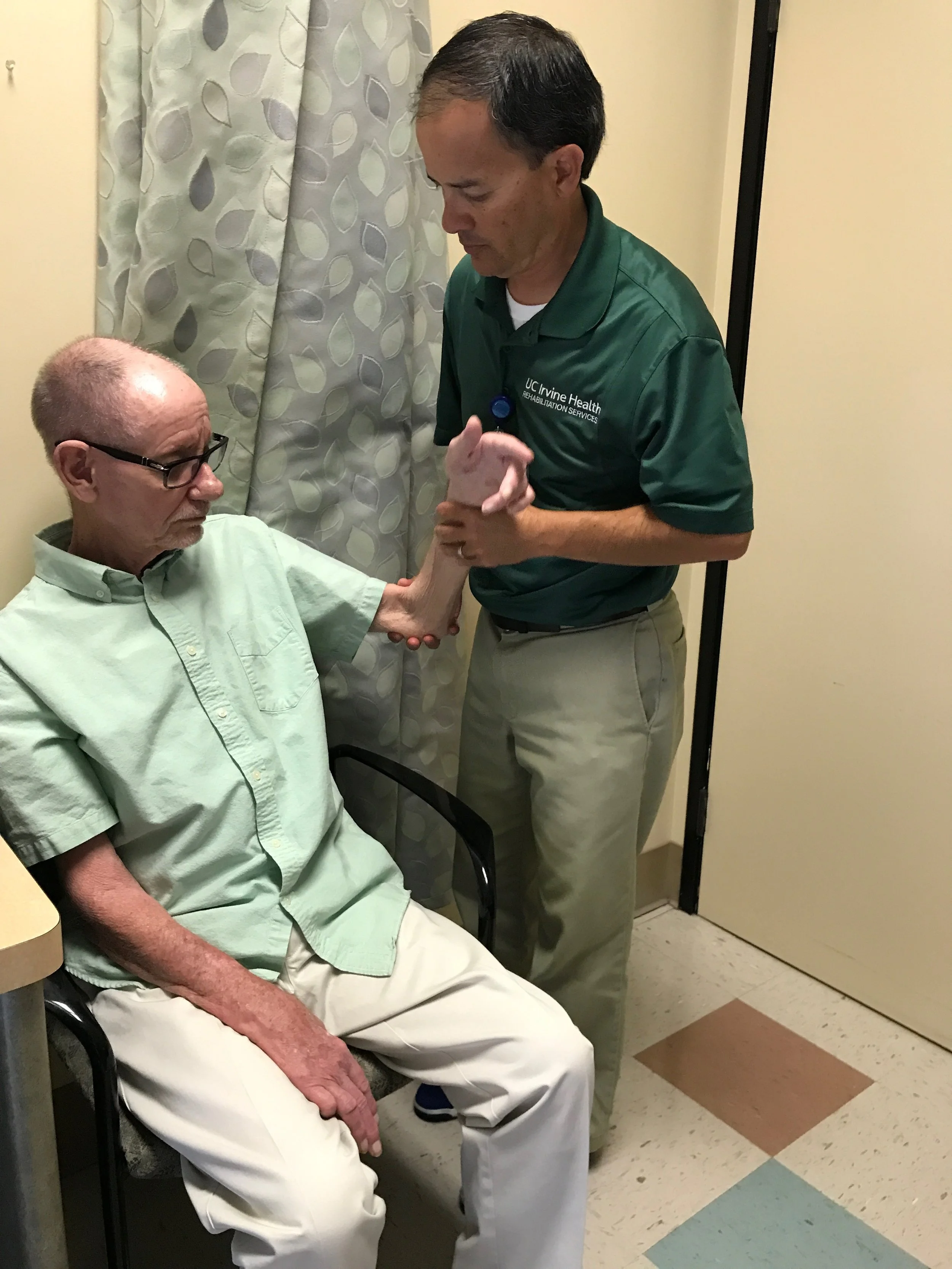 Though he has lost most of his strength in his arms and hands, Wehbe can walk fine, and even jump off the ground. He demonstrates as much to Goyal and his wife, Rita. His hops are numerous, lifting him off the floor in tandem with the smiles that fill the exam room.
