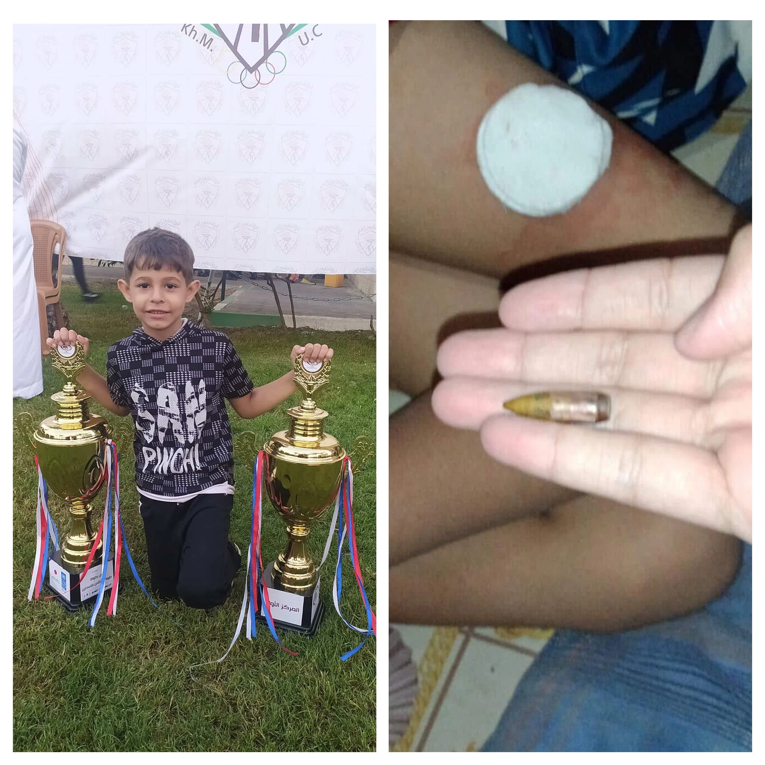 When I asked about the photo of a hand holding a bullet in front of someone’s bandaged leg, he told me that, “While we were sleeping at night, a quadcopter drone opened fire randomly on our tents. My little brother, Mohammed, was injured—he was shot in his foot.